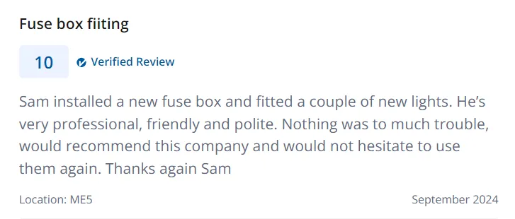 Sam came really quick to help with issue. He found a few hundred dead ants behind the socket and in socket. New socket installed and fair price . I am now getting more electrical work done and new fuse box in future. Explained everything clearly. Looking forward in getting electrics sorted if needed. Very nice bloke.